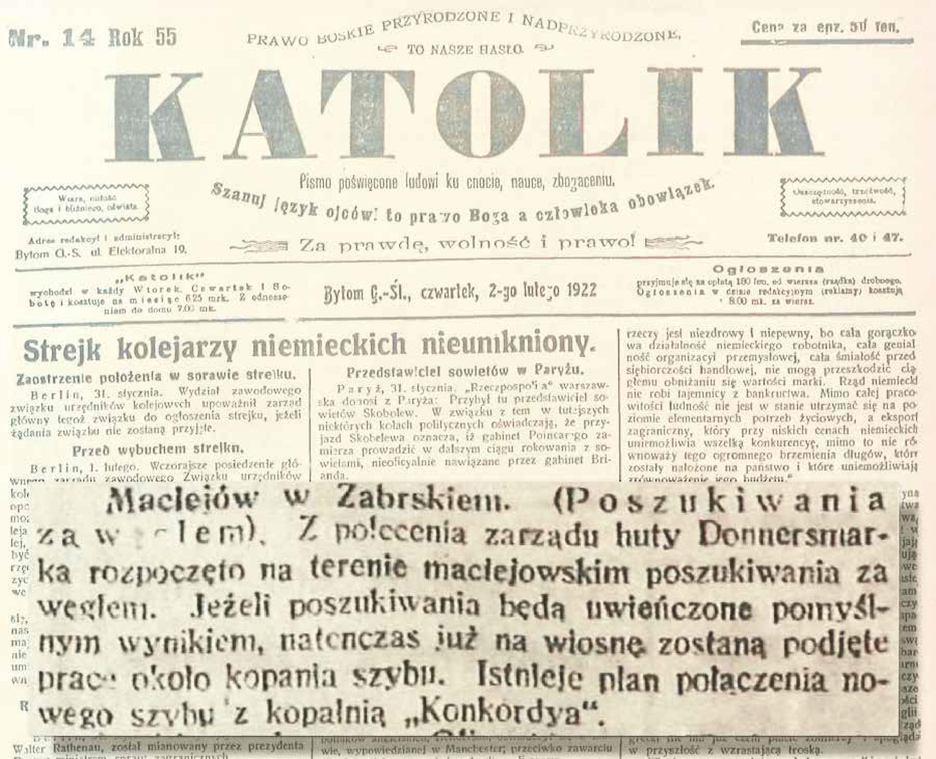 Die erste von ihnen erreichte 1921 Maciejów, wo der Maciej-Schacht mit einer Belüftungsfunktion gebohrt wurde. Sie war von Gebäuden und der für den Abstieg der Besatzung, den Materialtransport und den anschließenden Abbau von Kohle und Gestein notwendigen Infrastruktur umgeben. Der Maciej-Schacht sollte das Abbaupotenzial des Bergwerks durch die rationelle Ausbeutung der dünneren und stark gefalteten Flöze der Gruppen 600 und 700 wiederherstellen. Im Bereich des Maciej-Schachts förderte das Bergwerk Concordia im Jahr 1978 die letzte Tonne Kohle seiner Geschichte.